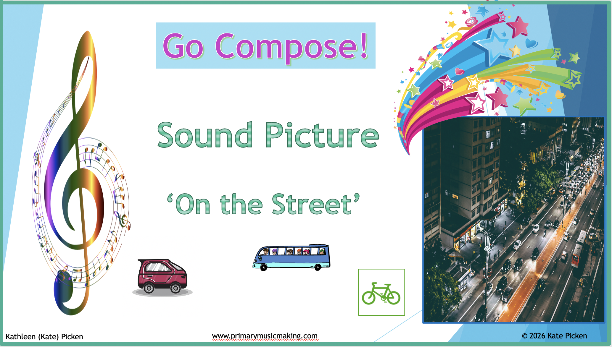 Go Compose – ‘On the Street’ is a PowerPoint resource for primary music, designed for children aged 5–8 years. It provides approximately 20 minutes of structured lesson content within a 30–40 minute weekly lesson and is intended to be delivered as a 6-week block (or longer).